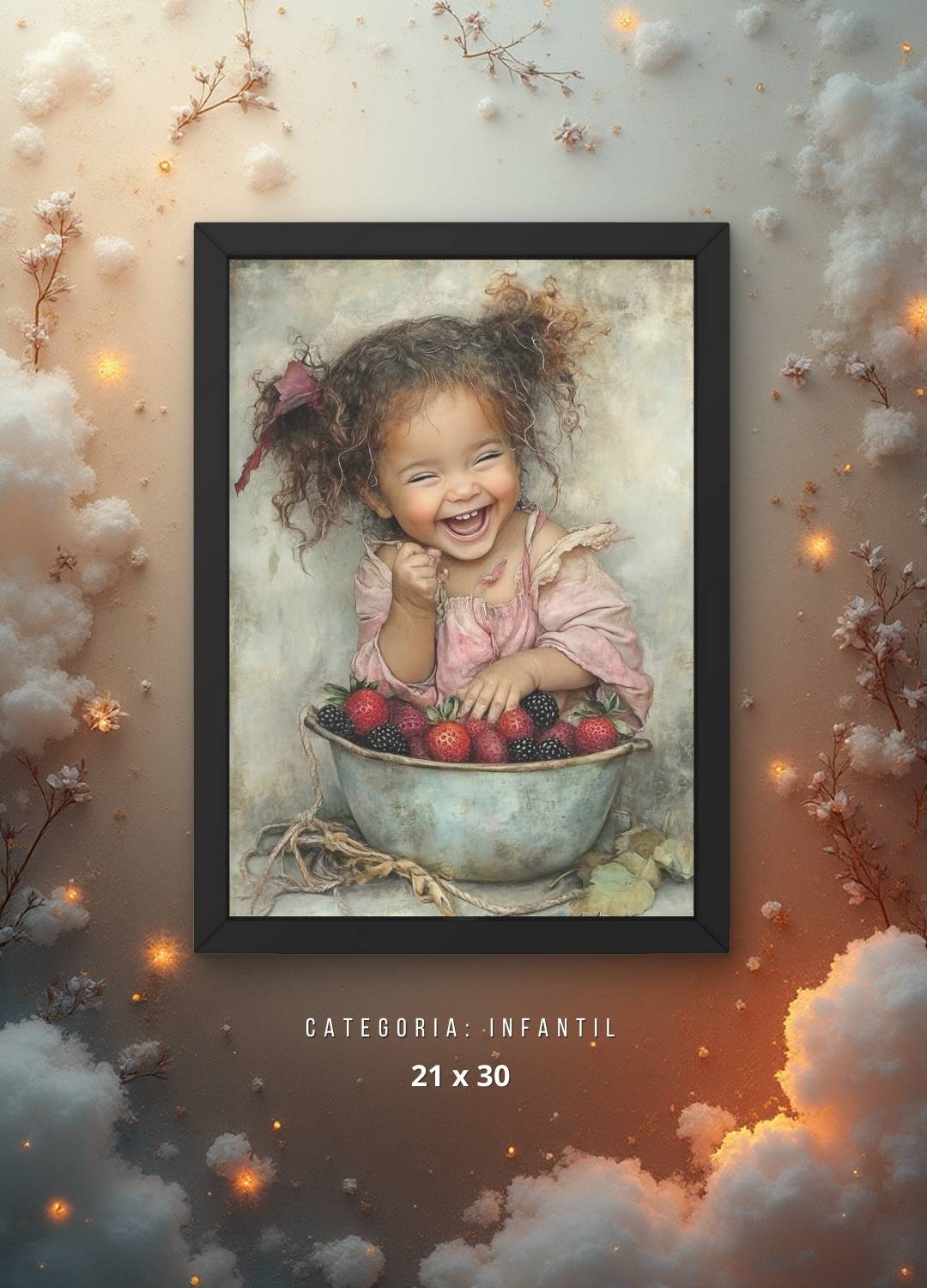 Destaque a doçura da infância com este encantador Quadro Decorativo Menina com Pote de Frutas Vermelhas. A pintura retrata uma menina segurando um pote de frutas vermelhas, trazendo um clima delicado, lúdico e acolhedor para quartos infantis, salas, cantinhos de leitura ou espaços criativos. Uma ótima escolha para quem busca unir arte, ternura e um toque colorido na decoração.