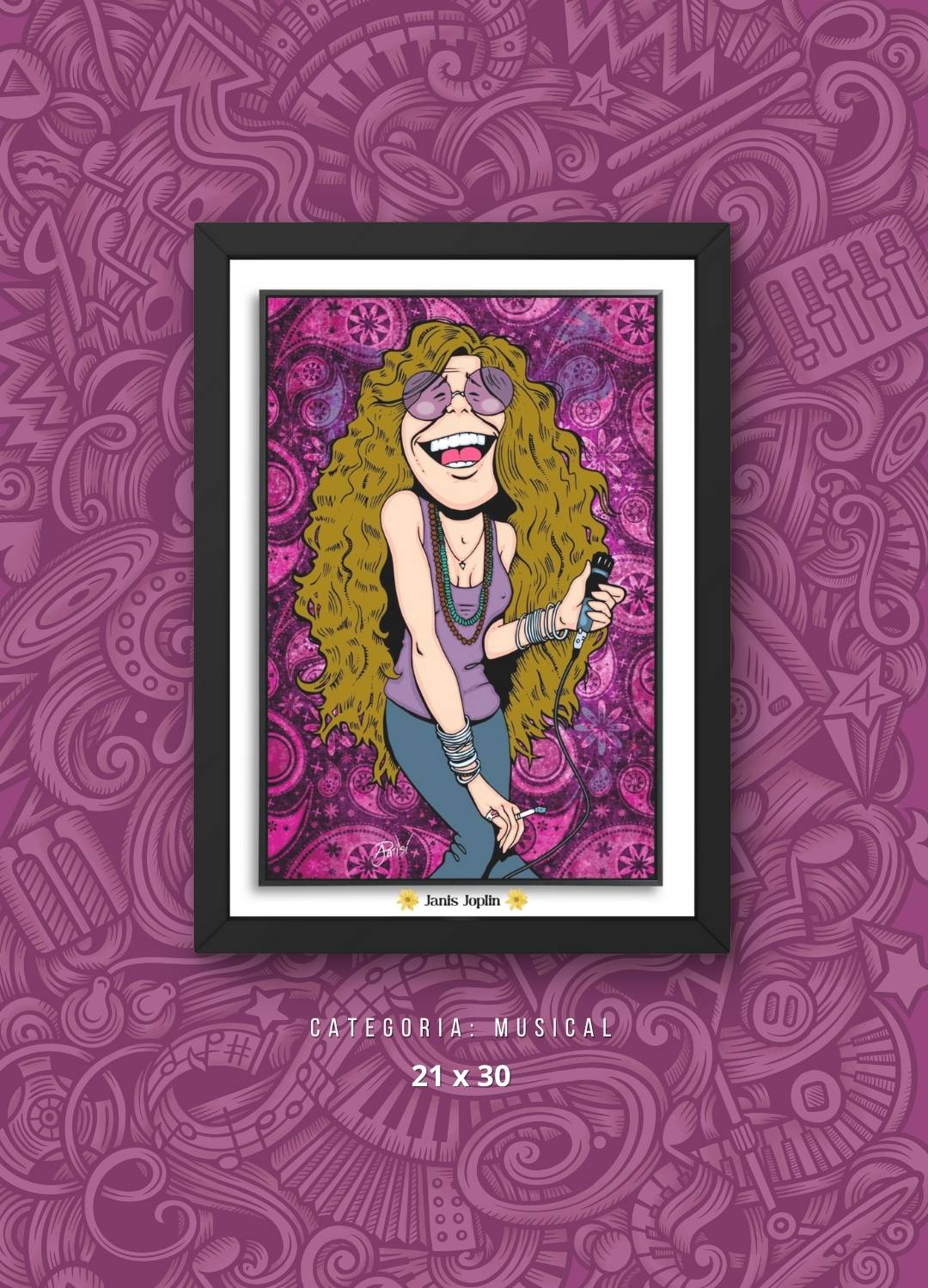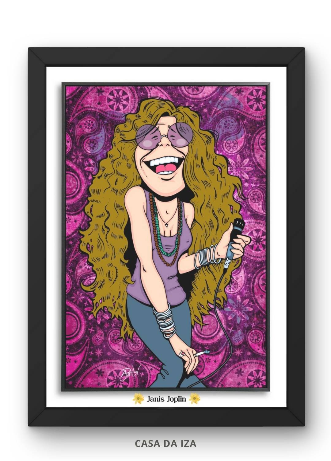Destaque seu ambiente com uma homenagem vibrante à lendária Janis Joplin! Este Quadro Decorativo Janis Joplin apresenta uma arte em caricatura exclusiva da icônica cantora, impressa em alta definição, garantindo sofisticação e durabilidade, fazendo deste quadro um item perfeito para fãs de música e decoração temática.