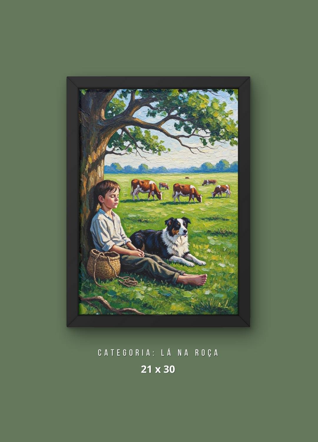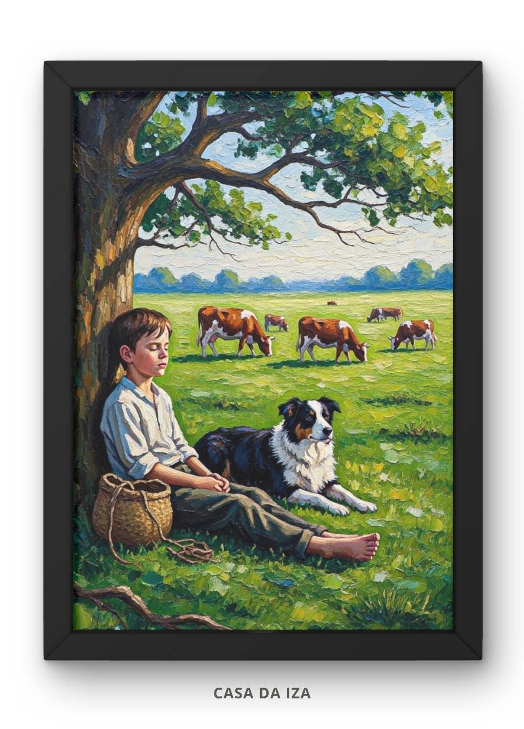 Capture a essência da simplicidade e da amizade verdadeira com este encantador Quadro Decorativo Menino e Cão na Zona Rural. Esta pintura evoca a paz do campo, com um menino sentado sob a sombra acolhedora de uma árvore, acompanhado pelo seu fiel cão em um verde pasto. Ideal para trazer aconchego e nostalgia a salas, quartos, escritórios ou qualquer espaço que valorize a beleza da vida rural e a conexão com a natureza.