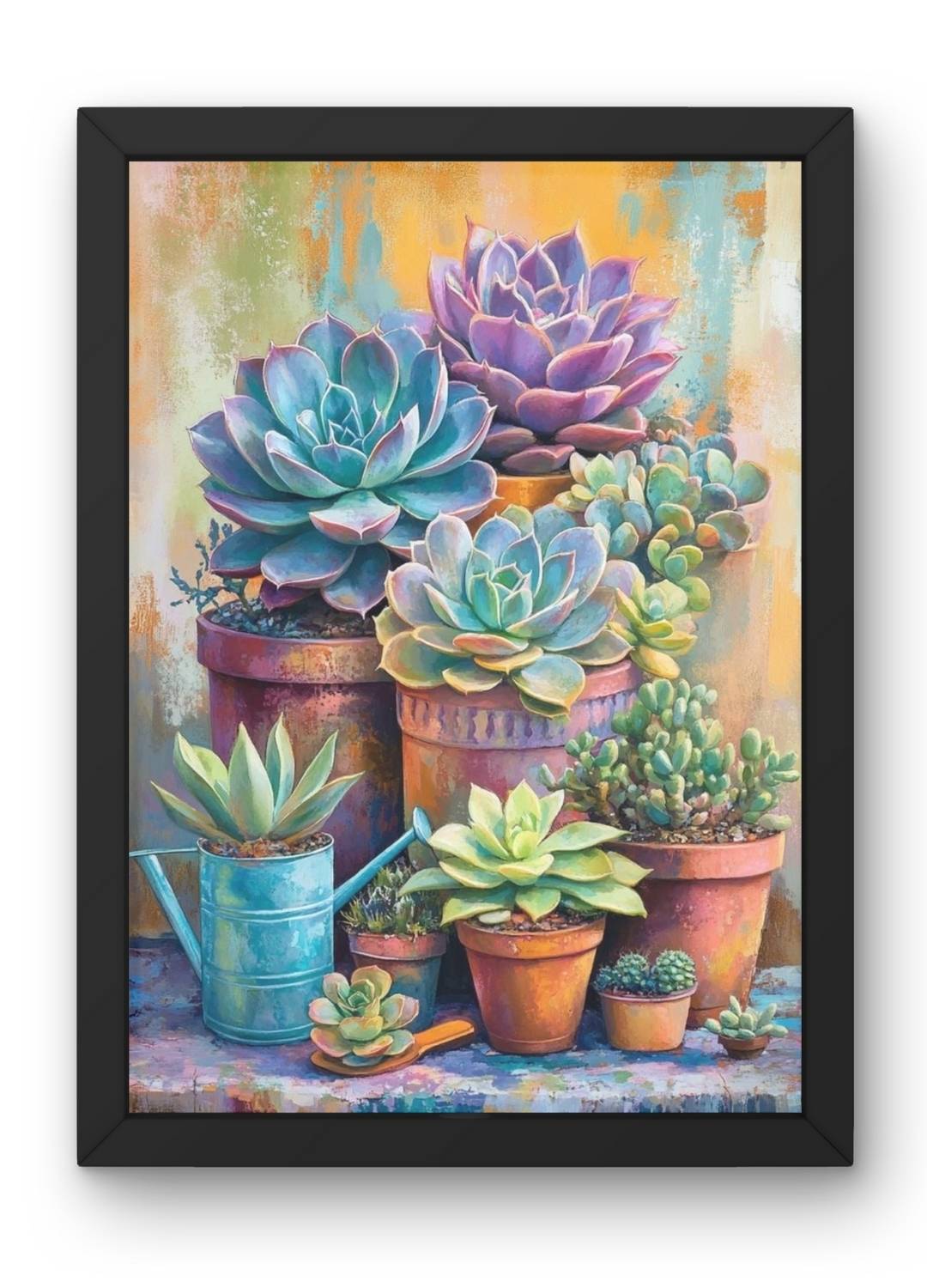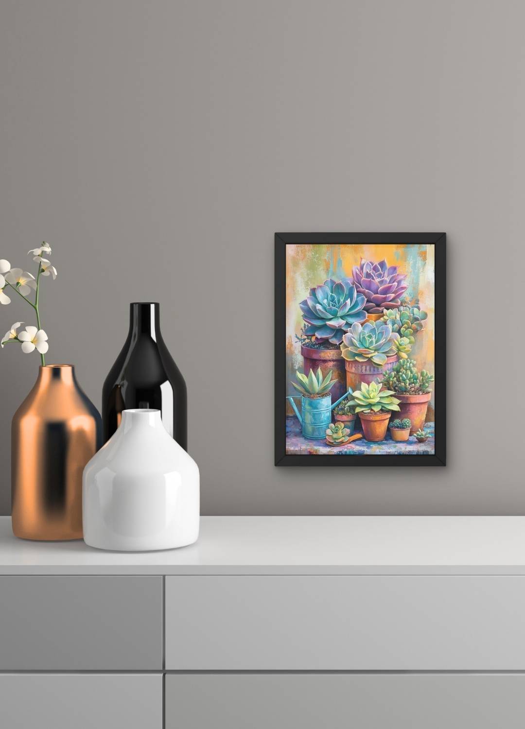 Transforme seu ambiente com o encanto das Suculentas em Pequenos Vasos, retratadas neste delicado quadro decorativo. As suculentas são reconhecidas por sua beleza única, versatilidade e facilidade de cuidado, além de serem excelentes purificadoras do ar, ajudando a trazer mais saúde e equilíbrio para o seu lar. Este quadro une estética e funcionalidade, proporcionando um toque natural e acolhedor para qualquer espaço, seja na sala, quarto ou escritório.